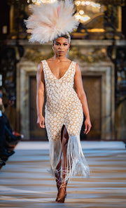 Debuted in Paris Fashion Week! This unique cream-colored dress with tassel details at the bottom, along with the crochet fabric...